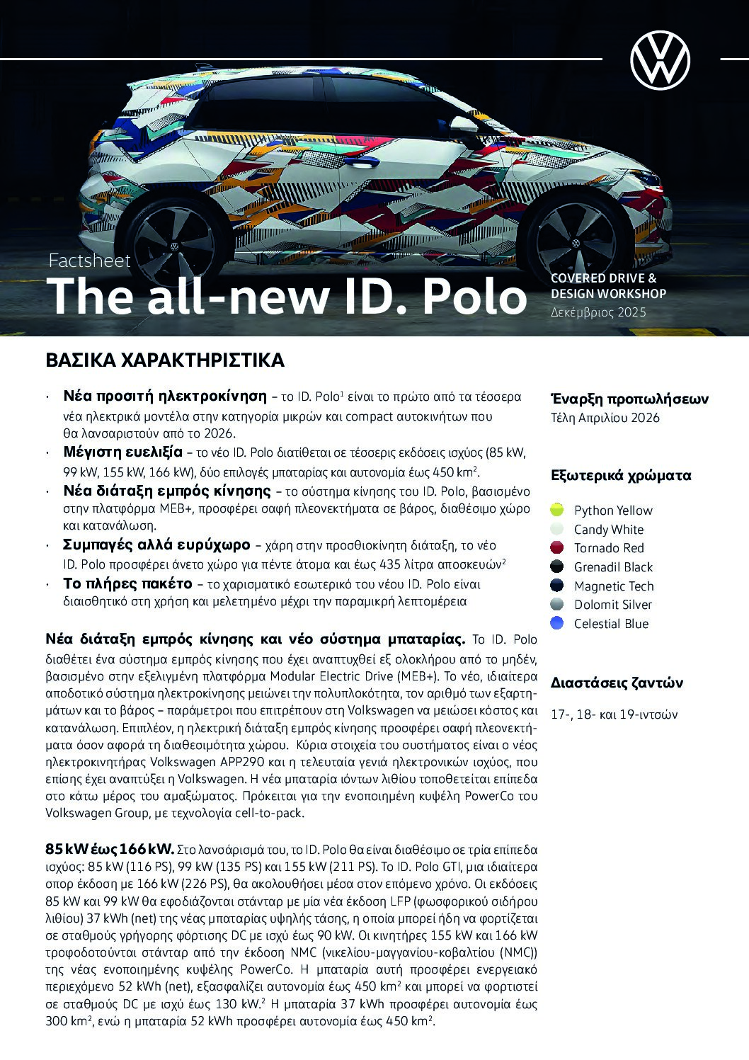 Με το ID. Polo, η Volkswagen μεταφέρει την εμπειρία και την αξιοπιστία ενός διαχρονικού best-seller στη νέα εποχή της ηλεκτροκίνησης. Συνδυάζοντας προσιτή τεχνολογία, προηγμένα συστήματα και υψηλό επίπεδο πρακτικότητας, το ID. Polo φιλοδοξεί να αποτελέσει σημείο αναφοράς στην κατηγορία των μικρών ηλεκτρικών αυτοκινήτων, ανοίγοντας τον δρόμο για τη μαζική μετάβαση στην ηλεκτρική κινητικότητα.
