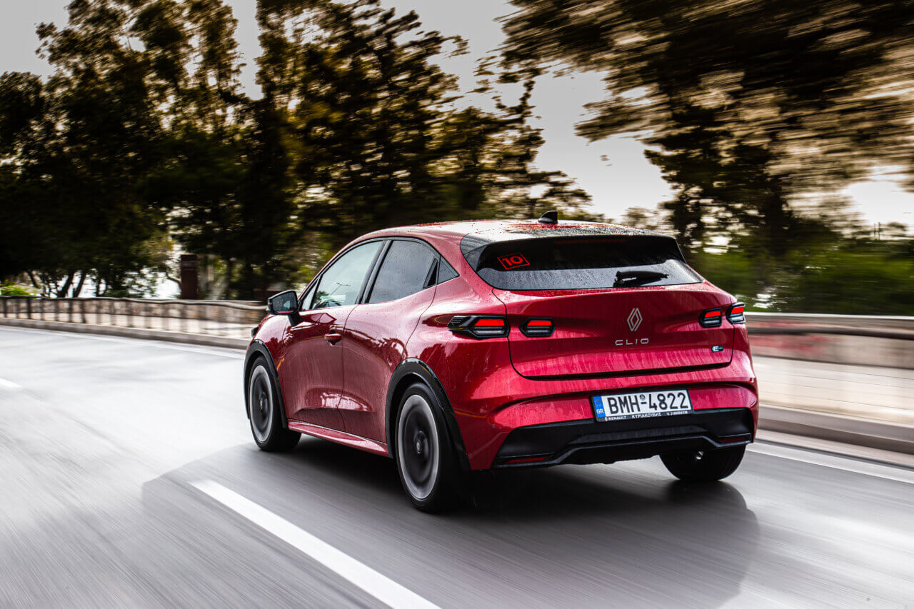 Στο πλάι, θυμάσαι πως είναι Clio με το χερούλι της πίσω πόρτας να βρίσκεται δίπλα από το τζάμι και στους θόλους υπάρχει το αντίστοιχο piano black καλυμμα πάνω από τους τροχούς για να δώσει μια ρετρό 90’s αίσθηση. Πίσω μοιάζει με κουπέ, καθώς η οροφή κατεβαίνει αισθητά προς τα κάτω, θυμίζοντας ίσως το Megane Coupe που δεν είναι και πολύ πιο μεγάλο από το νέο Clio. Φανάρια σε ζεύγη εκατέρωθεν του σήματος πίσω και ένα ducktail πορτμπαγκάζ να φιλοξενεί στο περίτεχνα σμιλευμένο κάτω μέρος του τα φανάρια.